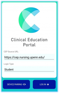 Once you have downloaded the app, find and click the app to open the CEP login process. You can log in as a preceptor or a student by clicking the login type shown in the sample screenshot below.