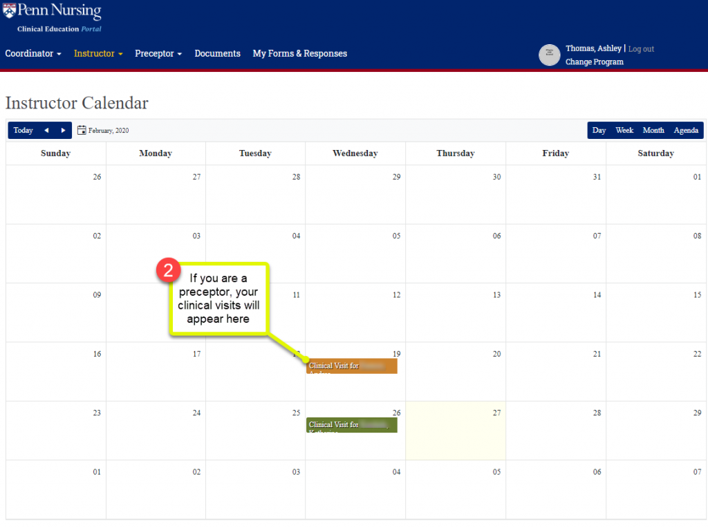 2.  If you are a preceptor, your clinical visits will appear in the calendar