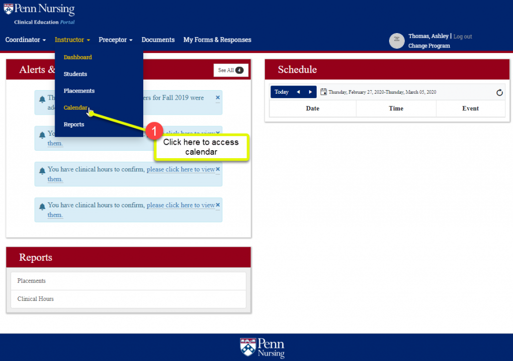 1. Click on “Instructor” dropdown, then select “Calendar”